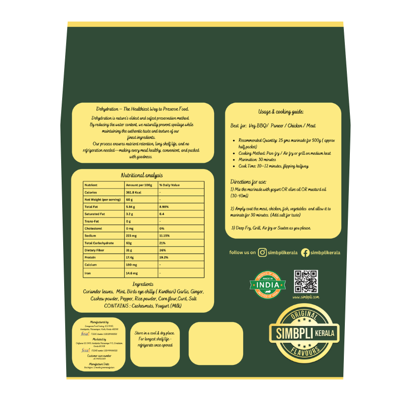 Mint & Bird’s Eye Chilli Marinade by Simbpli Kerala. 100% preservative-free, dehydrated, authentic Malayali flavours. Just hydrate, cook & enjoy.