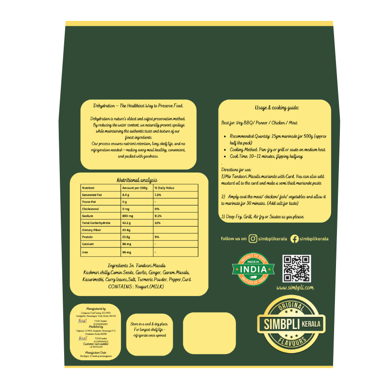 Tandoori Masala | Classic & Charred by Simbpli Kerala. 100% preservative-free, dehydrated, authentic Malayali flavours. Just hydrate, cook & enjoy.